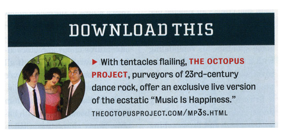 In several years of nearly non-stop touring with an infectious live show that often incorporates lights, projections, balloons and band members that simply can't stay in one place, The Octopus Project has developed an immense and loyal grassroots following, as evidenced by the band's 30,000+ MySpace friends. Anyone wondering about The Octopus Project's work ethic need only glance at the band's Summer/Fall tour schedule. After headlining Brooklyn's McCarren Park Pool Party in July, the band will kick-off three solid months of touring in August — first supporting Stereo Total, then Aesop Rock, followed by six weeks on their own headlining tour after the album's official October 9th release. This round of touring also marks the inauguration of guitarist Ryan Figg — an addition certain to push the band's live sound to the proverbial Next Level.