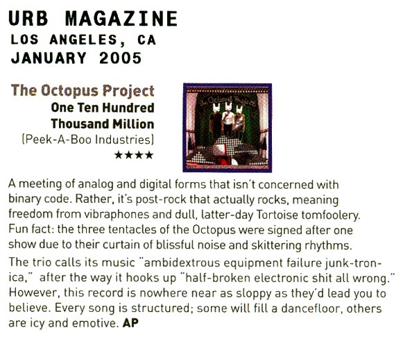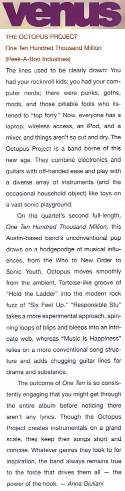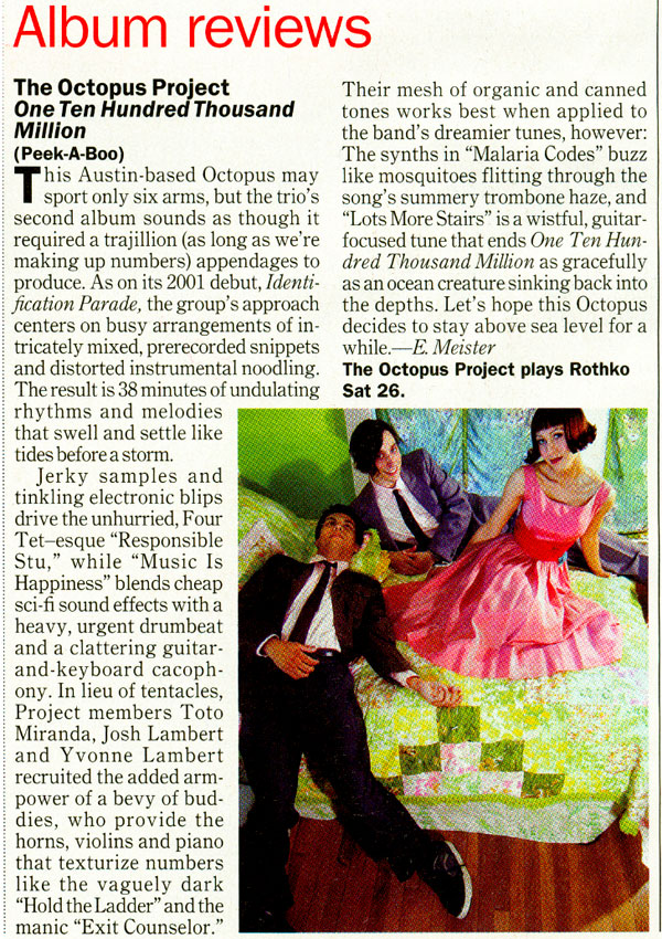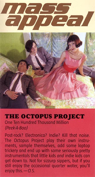 With ragged, furious distorted guitars at one end of the spectrum and the pure, luminescent tones of the Theremin at the other, the members of The Octopus Project mine a staggering variety of sounds in between (via strings, synthesizers, drums, glockenspiel, trombones, etc.), filling their songs with brilliant contrasting colors and cascading waves of sonic bliss. Although Josh Lambert, Yvonne Lambert and Toto Miranda each have their instrumental specialties, they spread ideas out on as many instruments as possible, each writing for and performing on any sound-maker they can find. And if the instruments themselves weren't enough, many sounds on the record were manipulated by the band to push them even further — inhuman drum breaks three layers deep piled over the original live drum track, a heavenly four-Theremin choir from a Wizard of Oz soundtrack that never existed, guitar parts mulched into bits and reassembled into a tiny Prince army.